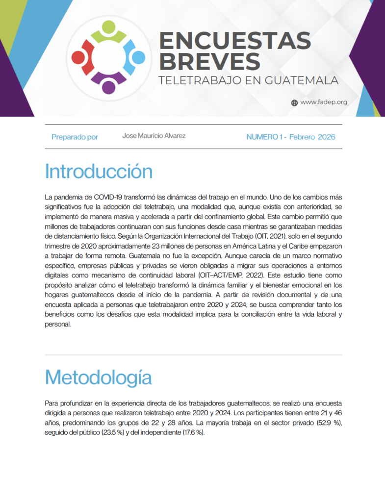 Encuentra breve: teletrabajo en Guatemala. Para profundizar en la experiencia directa de los trabajadores guatemaltecos, se realizó una encuesta dirigida a personas que realizaron teletrabajo entre 2020 y 2024. Los participantes tienen entre 21 y 46 años, predominando los grupos de 22 y 28 años. La mayoría trabaja en el sector privado (52.9 %), seguido […]