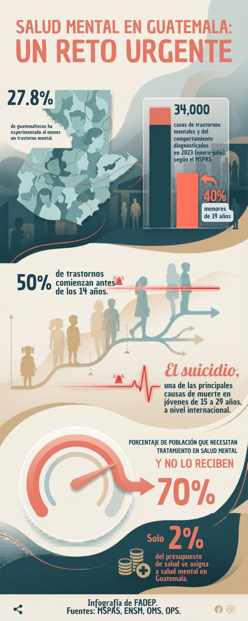 A nivel de atención en el sistema público, el Ministerio de Salud Pública y Asistencia Social (MSPAS) reportó que solo entre enero y julio de 2023 se diagnosticaron más de 34,000 casos de trastornos mentales y del comportamiento, siendo particularmente preocupante que casi el 40% corresponde a menores de 19 años. Este dato revela que la problemática no solo afecta a adultos, sino que impacta de forma directa a niños y adolescentes, es decir, a las nuevas generaciones que se están formando dentro de las familias.